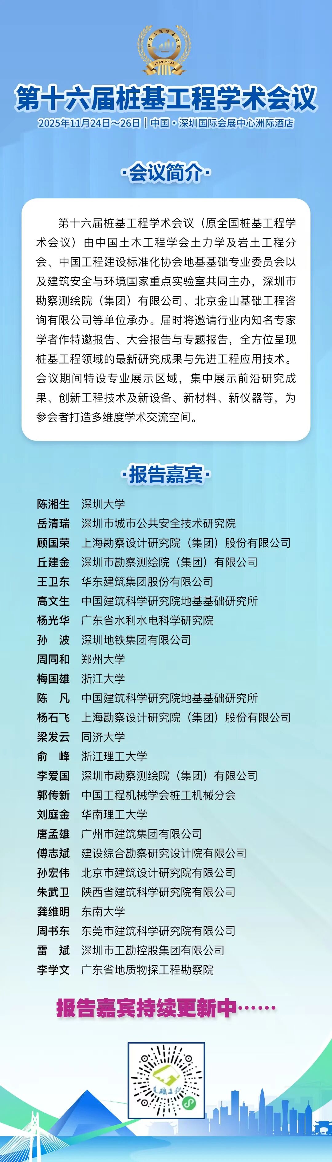 组织机构 会议主题 (1)桩基基本理论与试验研究 (2)桩基工程设计与实践 (3)桩基工程施工新方法及装备 (4)桩基动力响应与防震、减振技术 (5)桩基工程新材料与制作新工艺 (6)桩基工程检测与监测 (7)桩基工程典型案例与事故处理 (8)海洋工程中的桩基技术 (9)桩基工程技术标准有关问题 (10)基于AI的桩基智能化变革与数智化创新 (11)其他与桩基有关的工程技术问题 会议日程 会议期间特设专业展示区域,集中展示前沿研究成果、创新工程技术及新设备、新材料、新仪器等,为参会者打造多维度学术交流空间。欢迎有关企业报名参与,具体细节请联系报名专线。 报名专线联系人: 李 冉,18612339138 李 娜,15210863916 接下来我们会持续不断更新大会嘉宾,请大家多多关注!