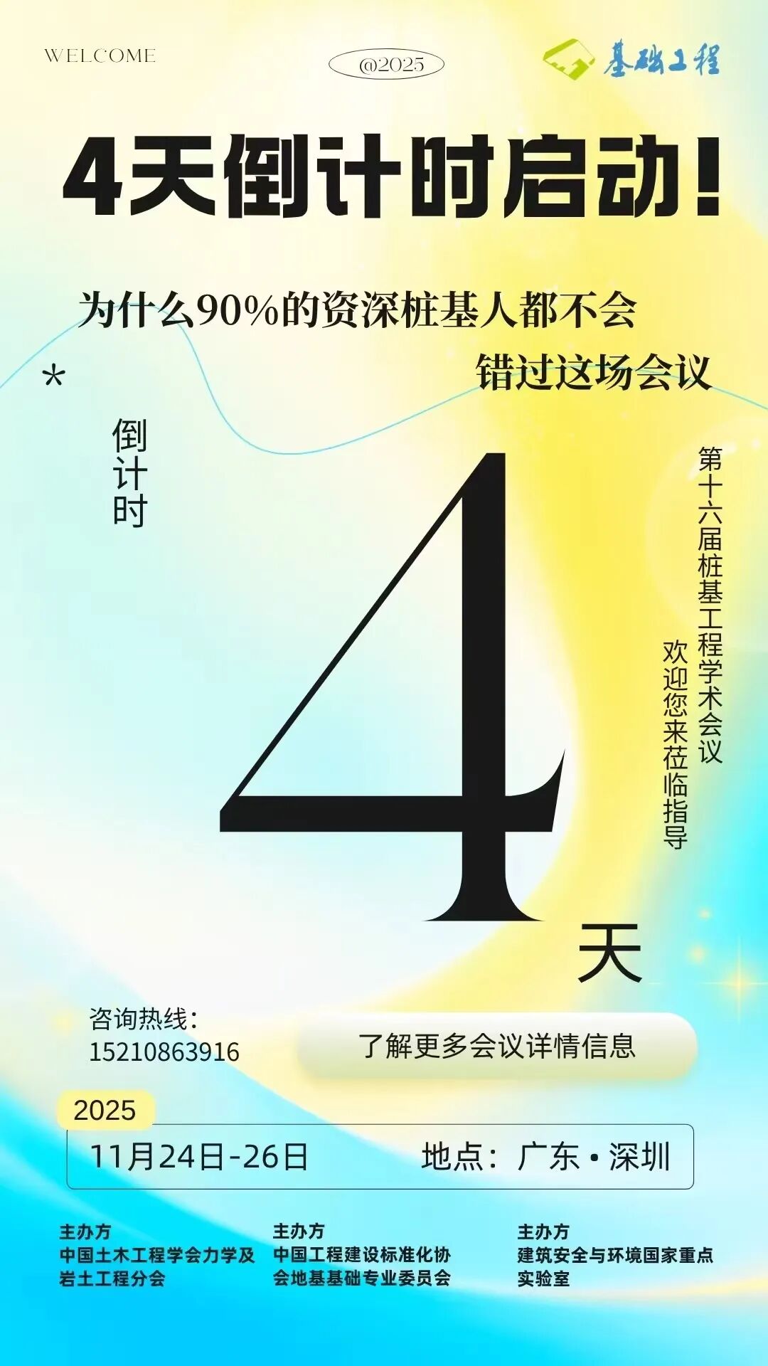 会议开幕倒计时开启! 自1993年首届举办以来,历经十五届积淀,桩基工程学术会议早已成为我国桩基领域的“技术风向标”。本届大会以“技术创新引领产业升级,协同合作共促行业繁荣”为主题,带来的不仅是知识盛宴,更是资源对接的黄金平台。 顶尖专家 陈湘生 高文生 岳清瑞 顾国荣 展会报告 01 部分嘉宾讲解的报告概述 Part.1 Part.2 会议期间特设专业展示区域,集中展示前沿研究成果、创新工程技术及新设备、新材料、新仪器等,为参会者打造多维度学术交流空间。 欢迎有关企业家与学生报名参与,具体细节请联系报名专线。 报名专线联系人: 李 冉,13671141780 李 娜,15210863916 王思祺,15701183916