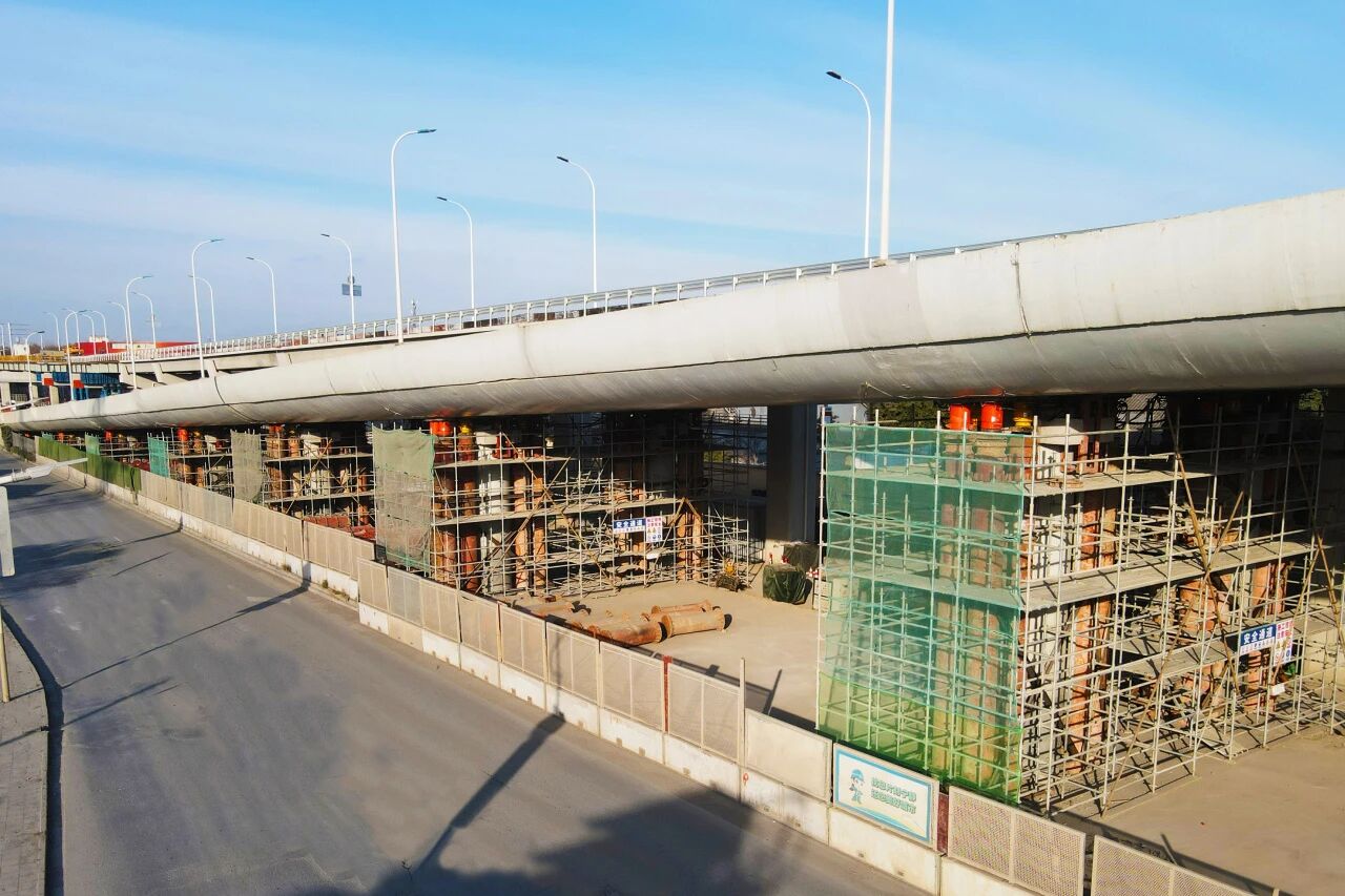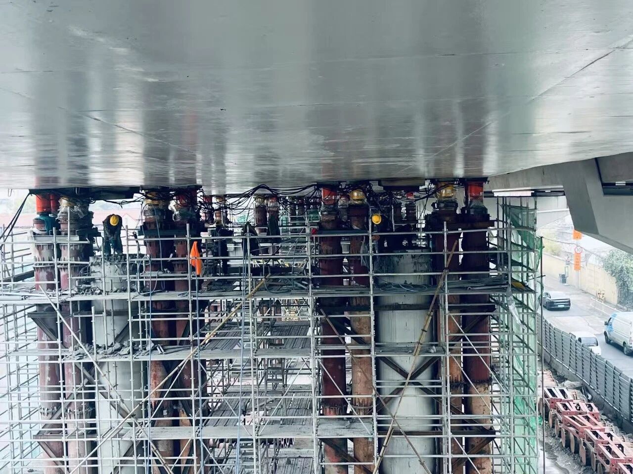 10月11日,由隧道股份参与建设的军工路快速路主线高架正式开放通行,标志着上海东部又新增一条南北向交通大动脉。 作为上海市中心城东部地区南北向快速通道的关键组成部分,军工路快速路新建工程的通车将进一步完善浦西中心城东北部快速路网,有效缓解军工路北段的交通压力,改善沿线交通环境,均衡五角场副中心周边地区交通状况,优化区域与外界沟通的交通环境。 结构顶升 百点同步发力 毫米级精度托起城市脊梁 由隧道股份市政集团承建的军工路快速路新建工程2标是全线难度较大、工况较为复杂的标段之一,其中民星路~翔殷路段共有10跨上部结构需要利用原中环民星路匝道上部结构进行顶升,顶升最大抬升高度为7.654米,创下上海市桥梁顶升高度最高纪录。顶升完成后,要与现状桥梁姿态一致,顶升精度要求极高。 施工时,隧道股份市政集团采用系统自动闭锁和机械锁紧双重保险液压千斤顶顶升,带自动跟随功能的机械千斤顶实时“保驾护航”,合计162台千斤顶等比例同步顶升。同时,利用PLC控制系统,采用位移与顶力双控技术,同步控制精度达到±1.0mm,压力传感器精度为±0.2Mpa,确保整个顶升过程安全且精准。这一系列技术突破,使项目较传统方案减少固体废弃物约97%,降低至少60%资源消耗,节省工期约50%,展现了绿色建造的示范效应。 路面铺装