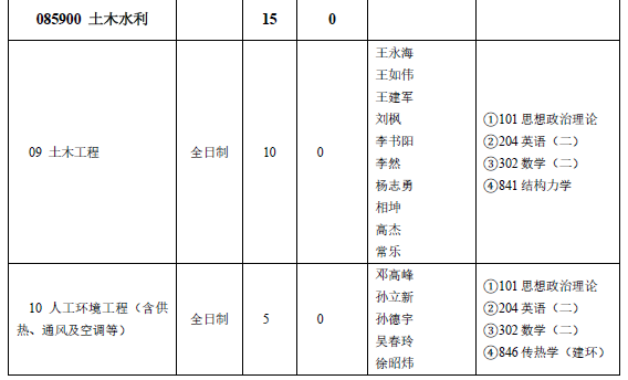 2.085900土木水利招生专业“09 土木工程”含岩土工程、结构工程、防灾减灾工程及防护工程等研究方向;“10 人工环境工程(含供热、通风及空调等)”含供热、供燃气、通风及空调工程相关研究方向。