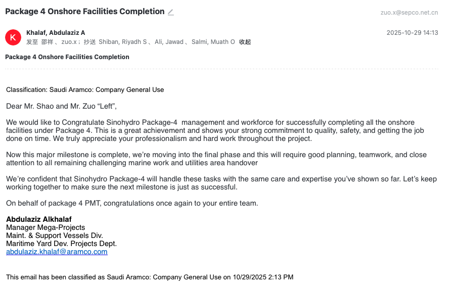 P4包陆域建筑物共48个单体,工程规模宏大、技术复杂、环境艰苦。10月29日,随着最后一个单体——B303多功能综合大楼完成全部尾项消缺并顺利移交,标志着P4包陆域建筑物移交任务全面告捷,项目建设进入最后冲刺阶段。P4包业主项目经理哈拉夫(Khalaf)发来感谢信,信中写道:“这一成就彰显了你们对质量、安全和按时完成工作的坚定承诺。我们由衷感谢你们在整个项目期间展现的专业精神和辛勤工作。”