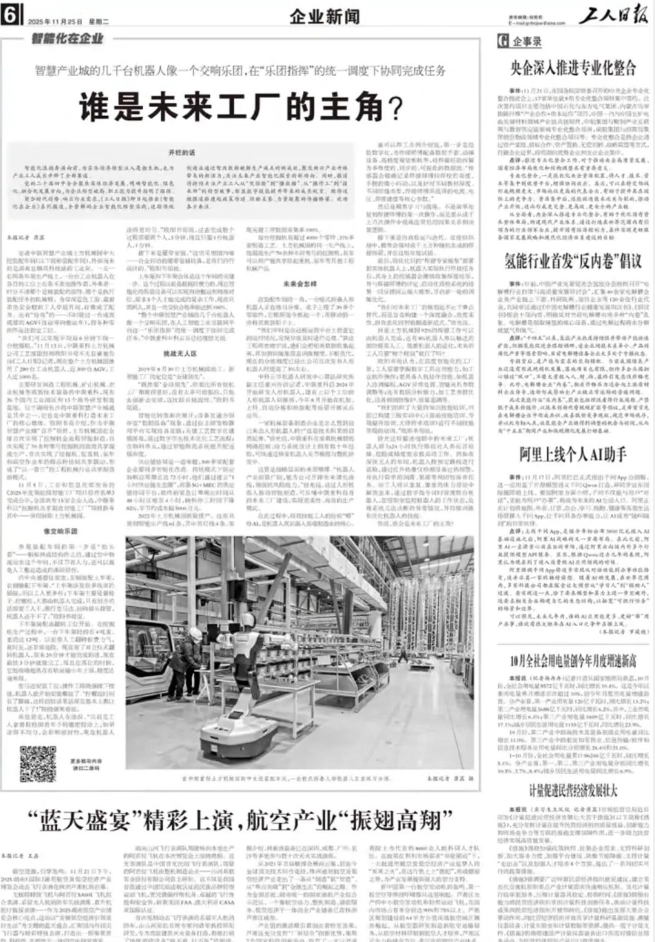 2025年11月25日,《工人日报》开始推出《智能化在企业》系列报道,全景解码企业智能化转型实践,追踪传统制造业通过智改数转破解生产痛点的新成效,聚焦新兴产业升级带来的新活力,关注未来产业智能化探索的新动向。首期报道标题为“谁是未来工厂的主角?”,以中联重科为典型案例,展现其引领行业的高质量发展成果。