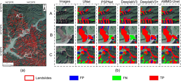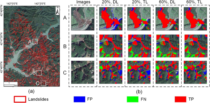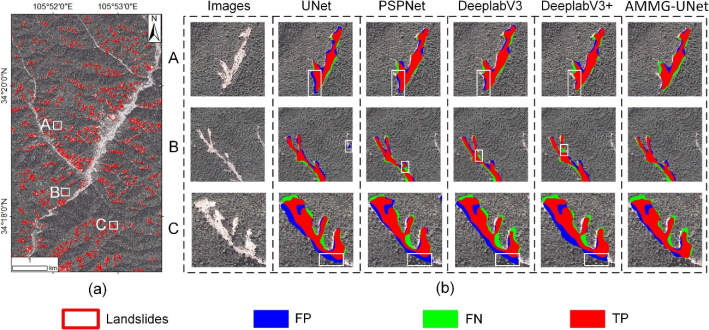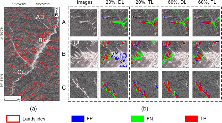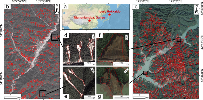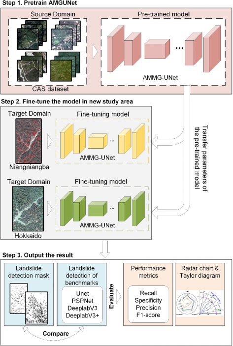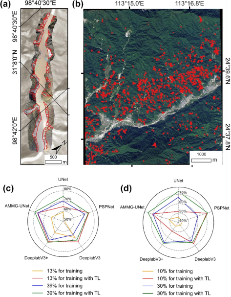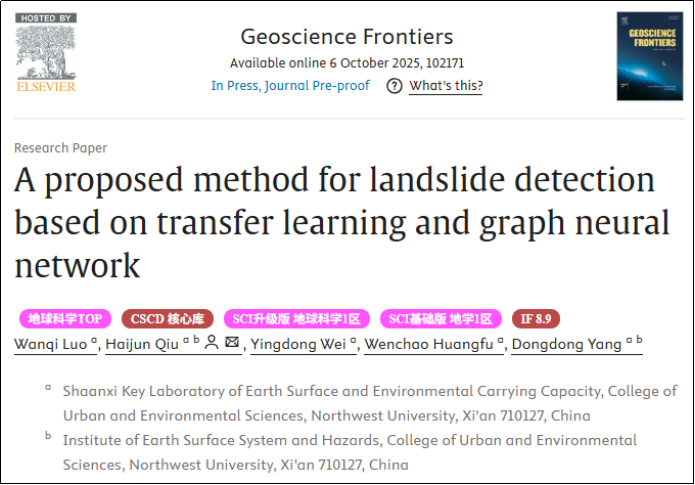 论文信息 Information 期刊: Geoscience Frontiers 作者: Wanqi Luo, a; Haijun Qiu, a,b; Yingdong Wei, a; Wenchao Huangfu, a; Dongdong Yang, a,b.. 工作单位: a: 西北大学陕西省地表与环境承载力重点实验室 b: 西北大学城市与环境学院地表系统与灾害研究所 摘要 Abstract 群体性滑坡事件发生后,快速识别滑坡能为应急响应提供及时信息。然而在短时间内往往难以快速获取足够的滑坡识别数据。迁移学习能够借助源领域的滑坡识别知识,仅需少量标注数据即可适应目标领域。图神经网络通过构建以像素为节点、连接关系为边的图结构,显式建模全局或局部关联,从而提升分割一致性。本研究提出一种融合注意力机制、多尺度连接与图神经网络的深度学习模型,用以捕捉上下文信息并提取滑坡识别关键特征。该方法首先在大规模数据集上进行预训练,随后在中国2013年娘娘坝降雨型滑坡与日本2018年北海道同震滑坡两个案例中实施参数迁移与微调。我们验证了所提模型的可行性,并研究了目标领域数据规模对滑坡识别的影响程度。对照实验表明,本研究提出的方法在数据充沛条件下能取得最优F1分数。结果还揭示:采用迁移学习的深度学习模型在数据有限条件下的表现可逼近数据充沛条件。微调模型既继承源领域知识又更新目标领域参数,即使新增数据极少也能在新区域实现性能显著提升。该方法为改进滑坡识别评估,特别是在滑坡样本极难标注的区域,开辟了潜在路径。