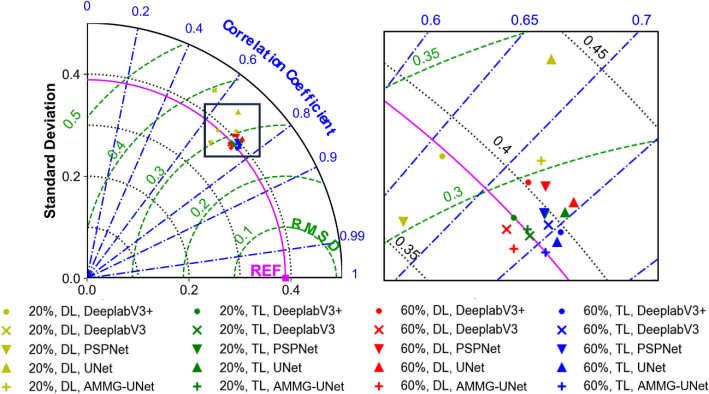 图表 Figures&Tables 图1 两个案例研究区域概览。(a) 案例区域地理位置;(b) 娘娘坝研究区;(c) 北海道研究区;(d,e) 源自Google Earth的娘娘坝局部区域;(f,g) 源自Google Earth的北海道局部区域。各子图中的红色多边形为滑坡边界。 图2 三个数据集中归一化像素值的密度曲线。(a) CAS数据集;(b) 娘娘坝研究区数据集;(c) 北海道研究区数据集。 图3 AMMG-UNet模型架构。(a) 本文提出的编码器结构;(b) 解码器结构;(c) 多尺度全局推理模块架构;(d) 图推理块架构。 图4 基于网络的深度迁移学习流程及本研究工作示意图。 图5 娘娘坝地区迁移学习后使用60%训练数据的滑坡识别模型可视化对比。(a) A、B、C区位置概览;(b) 不同模型在A、B、C区的识别结果。子图中白色框线标示出与本文提出模型存在差异的检测区域。FP、FN、TP分别表示假正例、假反例与真正例。 图6 不同条件下本文提出模型在娘娘坝地区的可视化对比。(a) A、B、C区位置概览;(b) 不同条件下提出模型在A、B、C区的识别结果。20%和60%表示训练数据占整个娘娘坝数据集的百分比。DL代表模型从头开始训练,TL代表微调模型。FP、FN、TP分别表示假正例、假反例与真正例。 图7 不同模型与真实值的泰勒对比图。右侧子图为左侧黑色框线区域的局部放大图。20%和60%表示训练数据占整个娘娘坝数据集的百分比。DL代表模型从头开始训练,TL代表微调模型。RMSD表示均方根差,REF指代作为对比基准的真实值参考点。 图8 北海道地区迁移学习后使用60%训练数据的滑坡识别模型可视化对比结果。(a) A、B、C区位置概览;(b) 不同模型在A、B、C区的识别结果。子图中白色框线标示出与本文提出模型存在差异的检测区域。FP、FN、TP分别表示假正例、假反例与真正例。 图9 不同条件下本文提出模型在北海道地区的可视化对比结果。(a) A、B、C区位置概览;(b) 不同条件下提出模型在A、B、C区的识别结果。20%和60%表示训练数据占整个北海道数据集的比例。DL代表模型从头开始训练,TL代表微调模型。FP、FN、TP分别表示假正例、假反例与真正例。 图10 不同模型预测结果与真实值的泰勒对比图。右侧子图为左侧黑色框线区域的局部放大图。20%和60%表示训练数据占整个北海道数据集的比例。DL代表模型从头开始训练,TL代表微调模型。RMSD表示均方根差,REF指代作为对比基准的真实值参考点。 图11 不同条件下各模型的F1-score对比。20%和60%表示训练数据占整个数据集的比例。DL代表模型从头开始训练,TL代表微调模型。 图12 本文提出模型生成的热力图。(a1, a2) 原始图像;(b1, b2) 预训练提出模型的热力图;(c1, c2) 使用20%数据且未迁移学习的提出模型热力图(20%,DL);(d1, d2) 使用20%数据且迁移学习的提出模型热力图(20%,TL);(e1, e2) 使用60%数据且未迁移学习的提出模型热力图(60%,DL);(f1, f2) 使用60%数据且迁移学习的提出模型热力图(60%,TL)。 图13 (a) 白格区域概览图;(b) 江湾区域概览图;(c) 不同条件下各模型在白格区域的F1 score;(d) 不同条件下各模型在江湾区域的F1 score。TL符号表示采用迁移学习的微调模型。 结论 Conclusion 本文提出了一种融合注意力机制、多尺度连接与图卷积网络的深度学习模型。通过调整训练数据量,我们在娘娘坝与北海道研究区将所提模型与UNet、PSPNet、DeeplabV3和DeeplabV3+进行性能对比,以评估迁移学习策略对深度学习模型的增强效果。当采用60%目标数据集训练时,本研究模型在两个案例区均获得最高F1分数,展现出显著鲁棒性。消融实验表明,结合注意力卷积、多尺度卷积与MGR模块可有效提升模型性能。此外发现,使用20%目标数据的微调模型与直接使用60%目标数据训练的模型具有相当的滑坡检测能力,这证实迁移学习能在训练数据有限条件下(尤其在娘娘坝地区)显著提升滑坡识别精度。Grad-CAM可视化结果验证了微调模型对植被覆盖区滑坡的检测能力增强。综上,本研究表明:结合迁移学习方法的复杂深度学习模型可有效弥补跨场景样本不足的缺陷。该策略显著缩短了从数据准备到模型部署的时间周期,对极端事件引发的群体性滑坡应急响应具有重要实践价值。